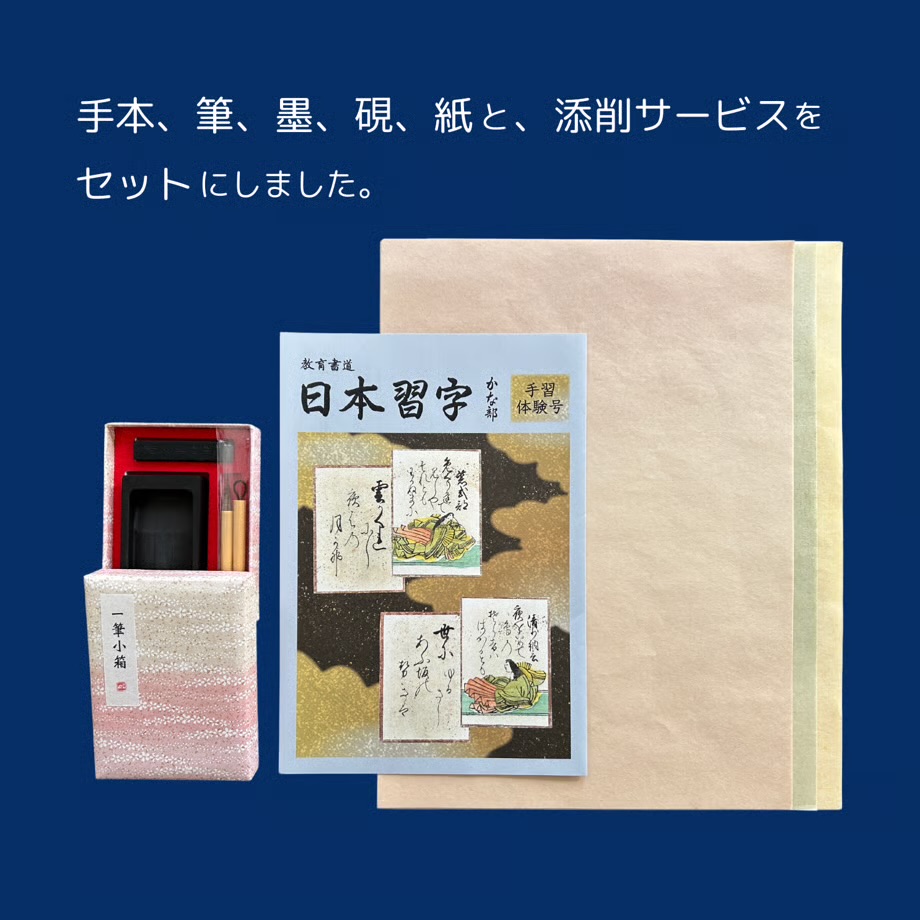 手本(1課題)と用具(筆・墨・硯・紙)、添削サービス(1回)を一つにした、かな書道の体験セットです。現在、日本習字にご入会されていない方を対象に、かな書道の楽しさ、日本習字での学びを知っていただきたくご用意いたしました。