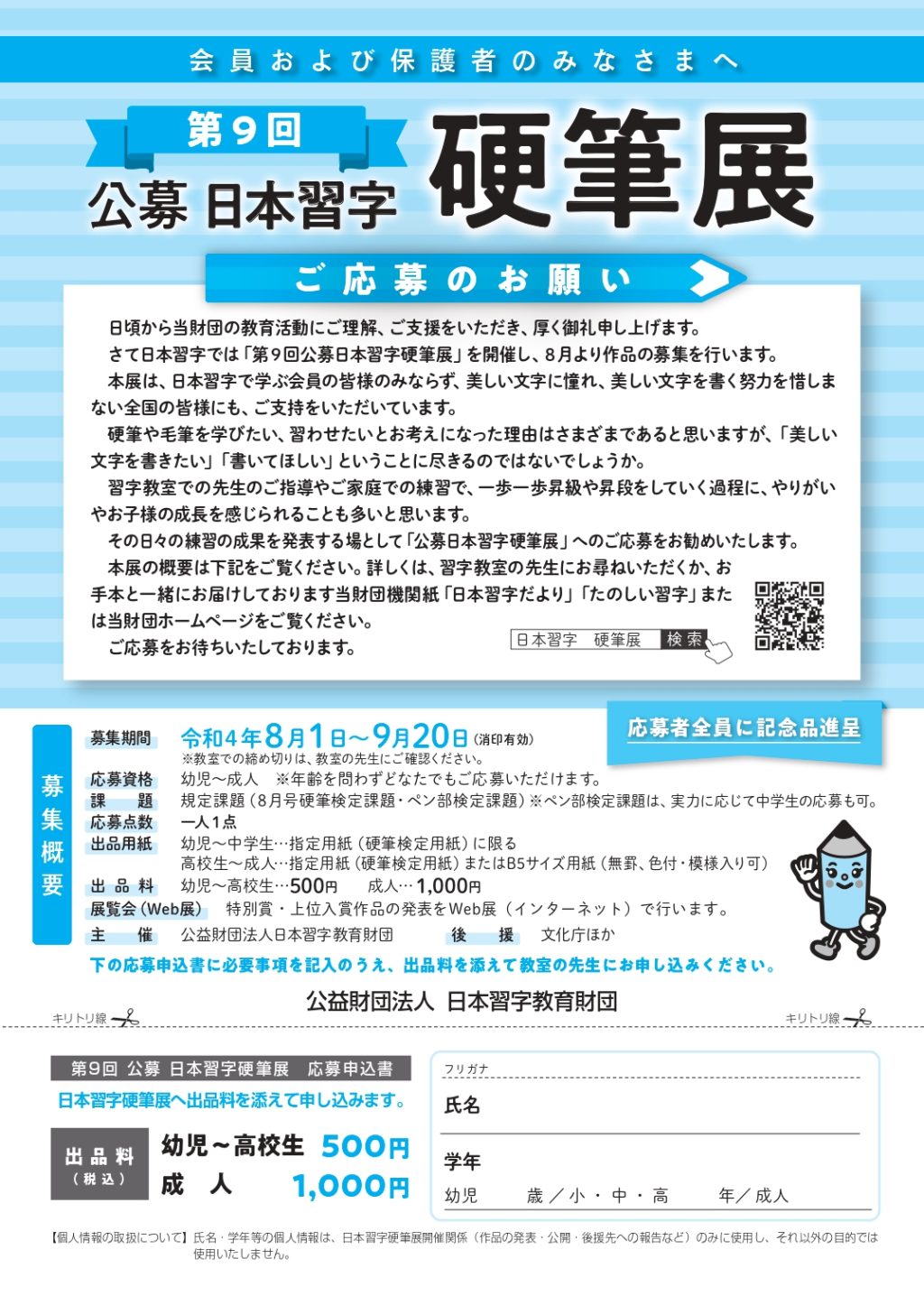 まなかな主宰、遠山ちひろです。本年の硬筆展のお知らせです。 第9回硬筆展硬筆展の詳細はこちら♪(別途参加費が必要です) 硬筆に特化した公募展となります。8月号の手本を使用しての取り組みとなりますので通常の日本習字の月例用 […]