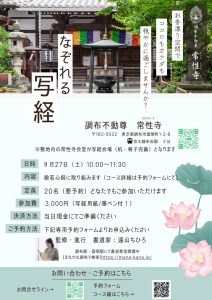 まなかな主宰遠山ちひろです。9月27日(土)の写経イベントですが定員に達しましたのでご報告いたします。 会場である調布不動尊 常性寺さんのご紹介です。 ご覧ください!なんと美しいお庭でしょう!! 入り口から一歩入ると何故 […]